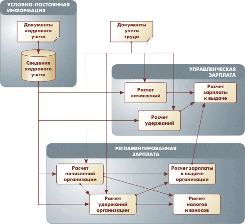 Схема основных движений данных при расчете зарплаты показана ниже.
